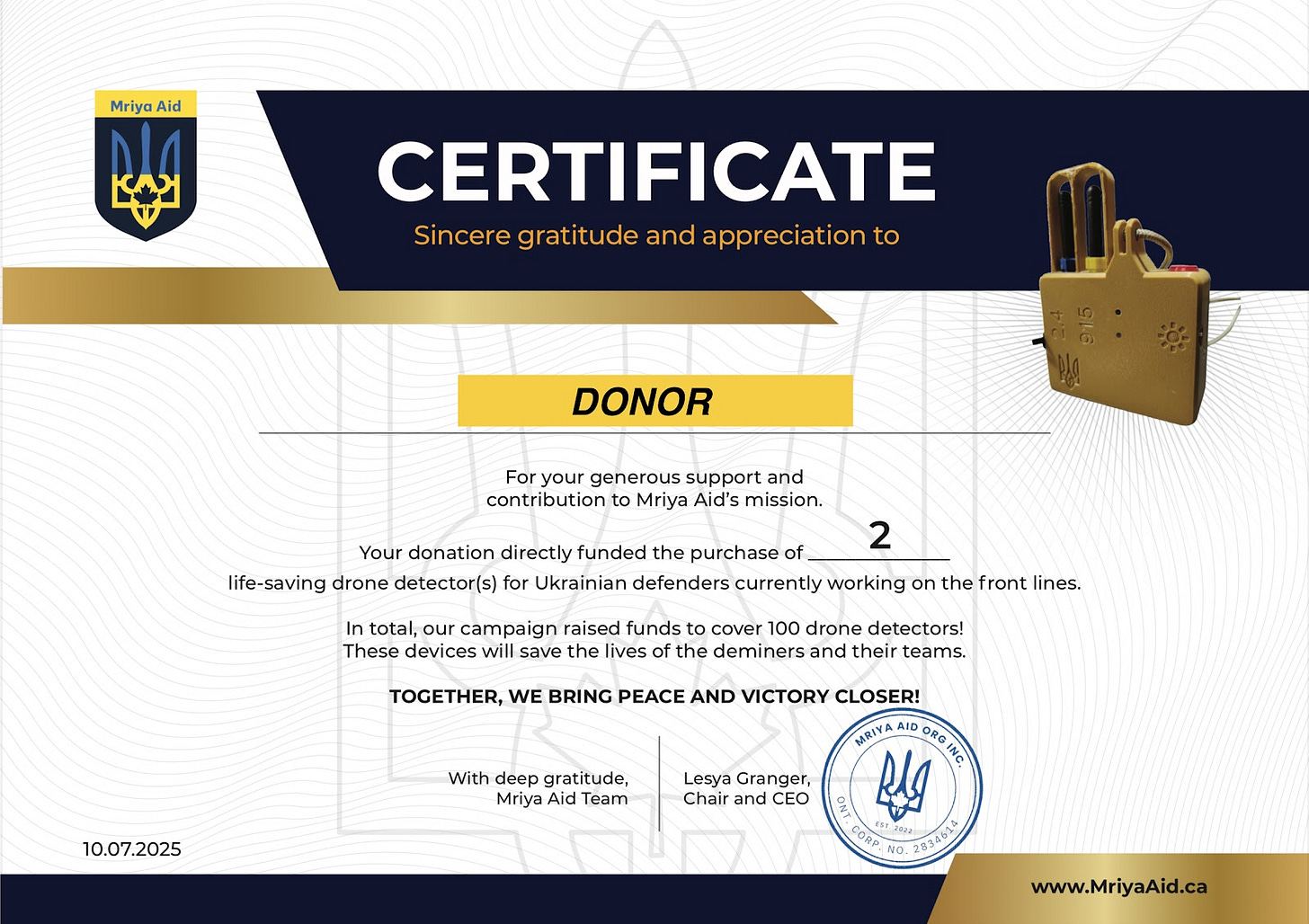 Thanks to donor support, in June Mriya Aid delivered 100 drone detectors called Tsukorok (“Candy”) to frontline AFU sapper teams. The generosity of each donor who contributed to the fundraising campaign that ran from April 28 to late June is being acknowledged by a certificate of appreciation from Mriya Aid.