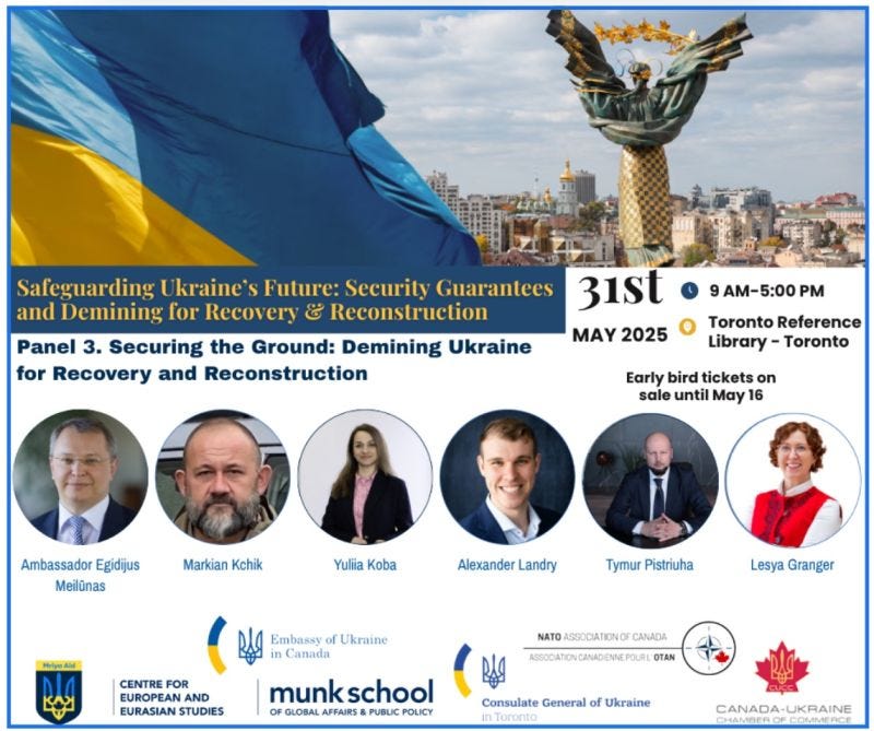 Throughout 2025, Mriya Aid remained active in international advocacy and professional forums focused on Ukraine’s recovery. On May 31, together with the NATO Association of Canada, the Canada-Ukraine Chamber of Commerce, the Munk School of Global Affairs, and the Embassy of Ukraine in Canada, we co-organized Safeguarding Ukraine’s Future: Security Guarantees and Demining for Recovery and Reconstruction. The conference brought together over 150 participants from government, diplomacy, defence, civil society, and academia, elevating mine action on Canada’s policy agenda.
