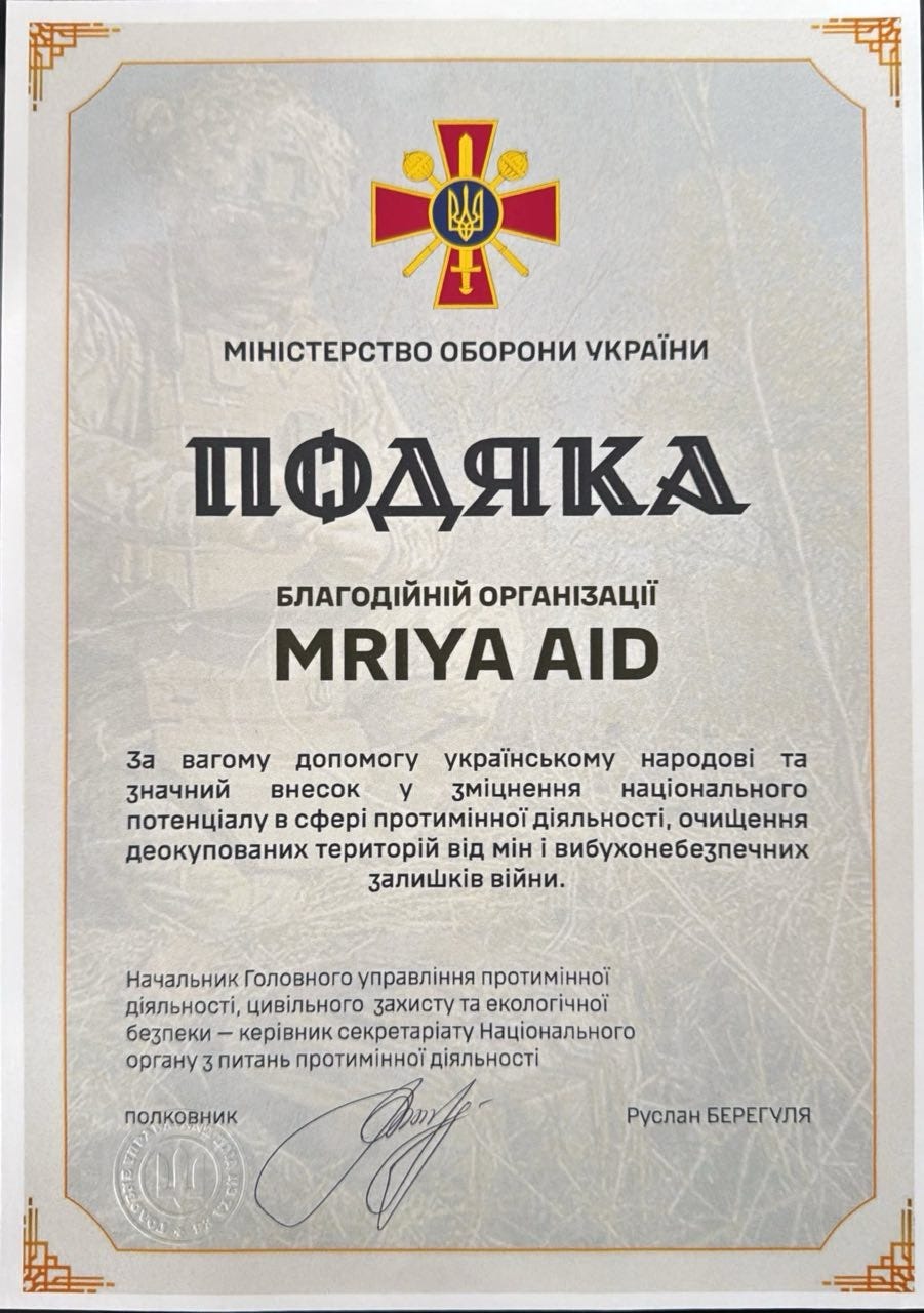 “Mriya Aid’s EOD Train and Equip project is a significant contribution to building Ukraine’s national mine action capabilities and demining capacity.”